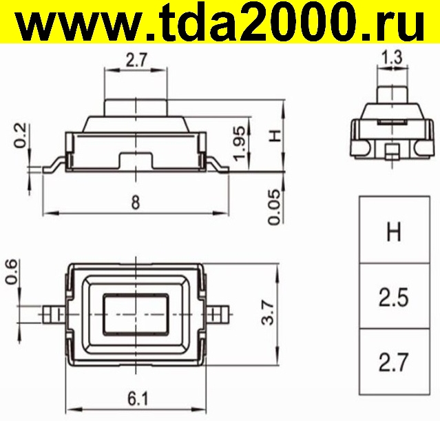 Кнопка 6.1×6.6мм шток 2.5мм KAN0647-0311B (4pin) smd тактовая