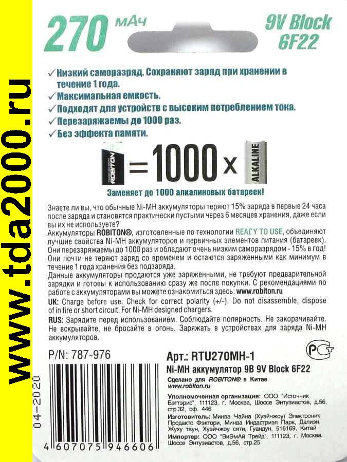 Аккумулятор 9,0в 270мАч Ni-Mh 6LR61 (Крона) ROBITON (с низким саморазрядом)