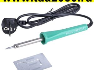 Род тока: переменный, частота тока 50Гц, номинальная потребляемая мощность 40Вт, класс защиты – II, степень защиты от влаги IPXO, рабочая температура паяльного стержня 380°С – 460°С, время разогрева до температуры 380°С не более 8 минут, масса не более 0,1 кг, габаритные размеры без шнура не более 300х30 мм