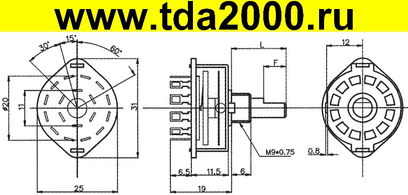 Переключатель ПГК-2П8Н (73-90г) Косая лыска вал 15мм галетный