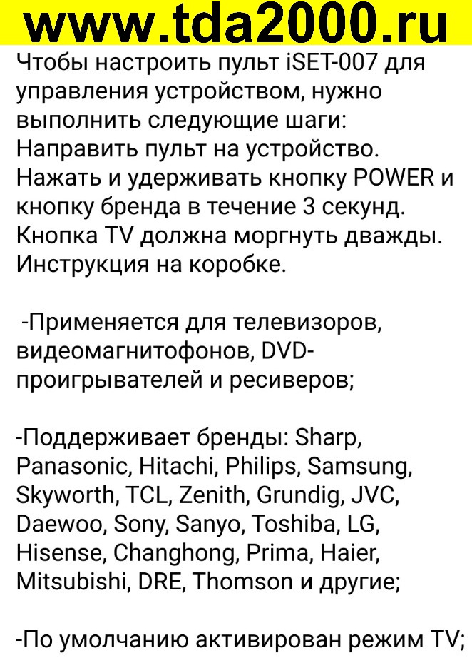 Пульт Iset-007 (Rtv-02/RTV-01/RTV-02/TV/DVD/VCR/STB/LCD) multi универсальный