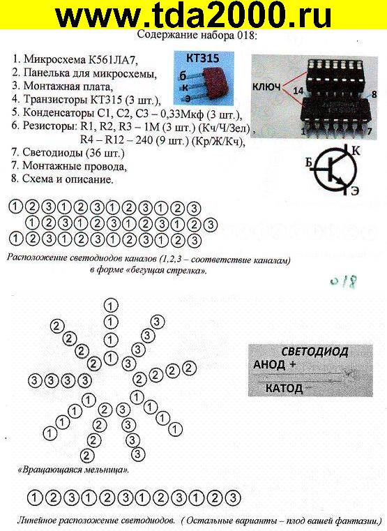 Ключи на транзисторах КТ315 управляют светодиодами. 36 светодиодов, входящих в комплект, позволяют создать различные геометрические фигуры, наглядно реализующие данный эффект.