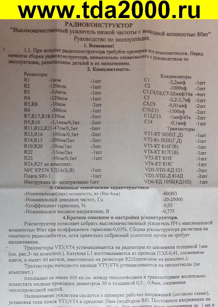 Радиоконструктор позволяет собрать высококачественный усилитель НЧ с максимальной мощностью 80 Вт при коэффициенте гармоник 0,03%. Сборка конструктора рассчитана на опытного радиолюбителя, хотя правильно собранный усилитель почти не требует налаживания.
